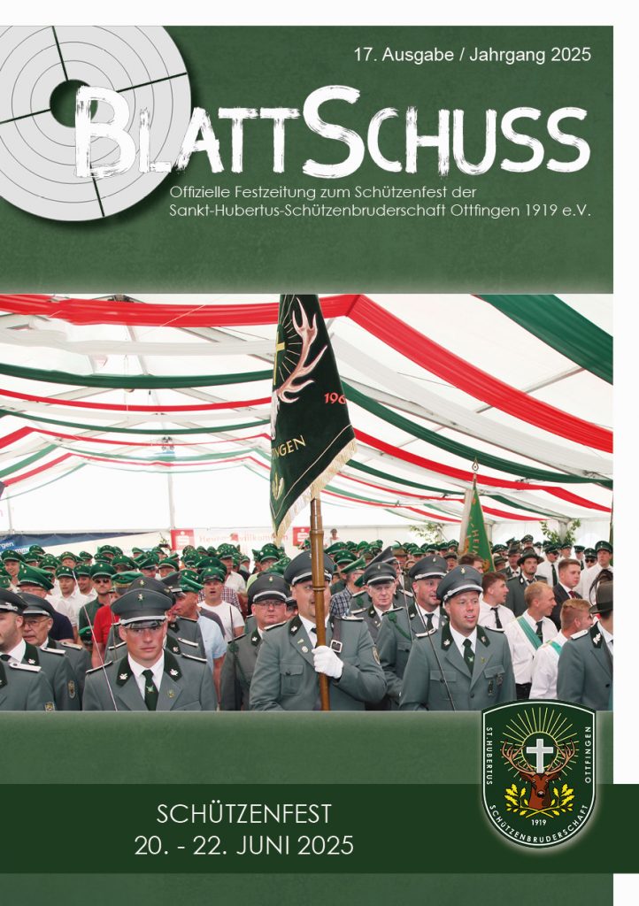 Seit 2006 gibt es Ihn, den “BlattSchuss” die offizielle Festzeitung zum Ottfinger Schützenfest. Der BlattSchuss informiert über alle Themen zu dem anstehenden Schützenfest und gewährt uns einen Einblick in das Leben der amtierenden Majestäten. Der BlattSchuss wird durch die Korporalschaften kostenlos an alle Ottfinger Haushalte verteilt.